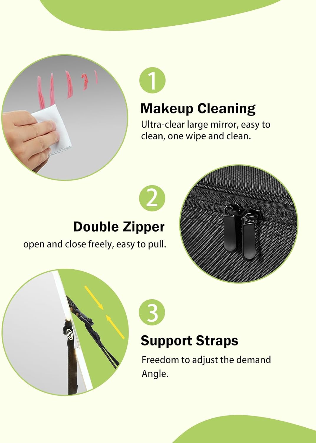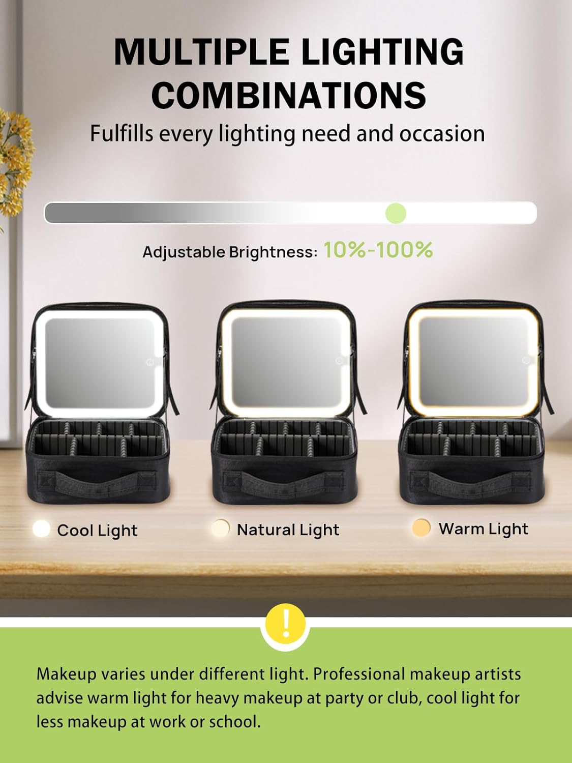 - Our makeup bag has an LED mirror with three lighting modes (warm, natural, and cool) and adjustable brightness. Perfect for any occasion, you can customize the lighting for flawless make-up application